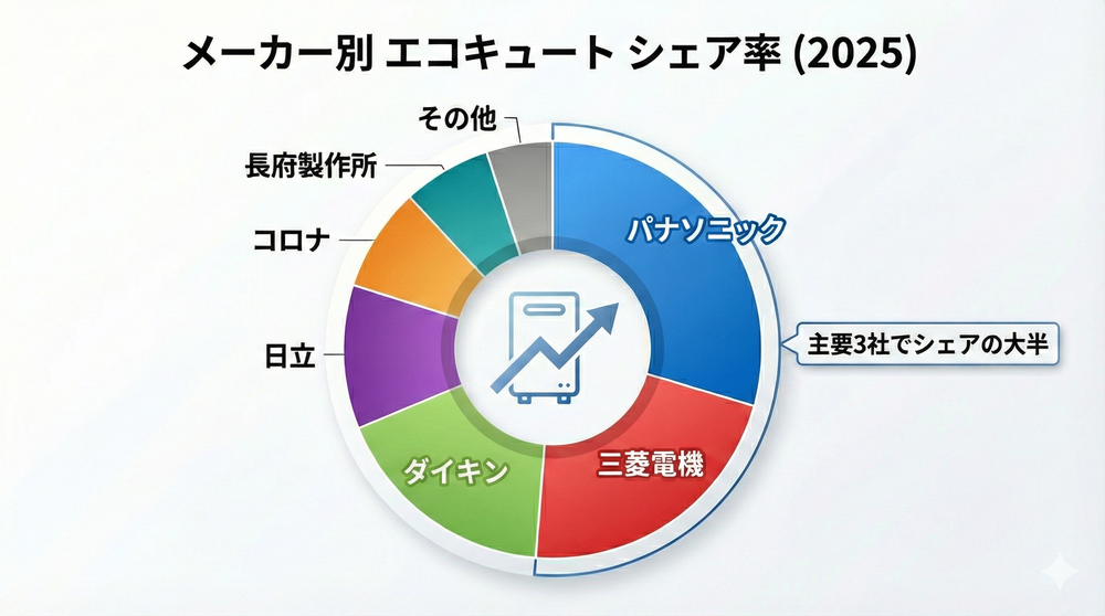 2024年から2025年にかけてのエコキュート市場においても、パナソニック、三菱電機、ダイキンの3社が圧倒的なシェアを誇り、業界を牽引し続けています。これら3社で市場全体の過半数を占めていると言われており、「エコキュートの3大メーカー」と呼ばれています。